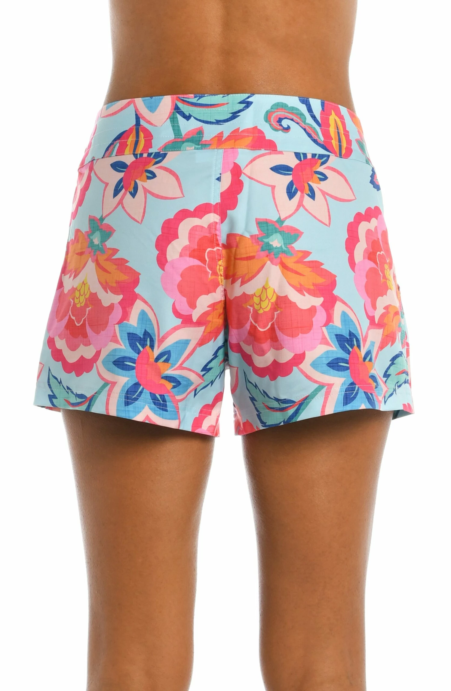 A light blue background provides the perfect backdrop for a profusion of tropical flowers on these boardshorts. Providing plenty of room to move while giving you a little extra coverage, they’re perfect for everything from snorkeling to paddleboarding to hiking to a waterfall. The waist adjusts for a comfortable fit and the 3″ inseam lengthens the legs.