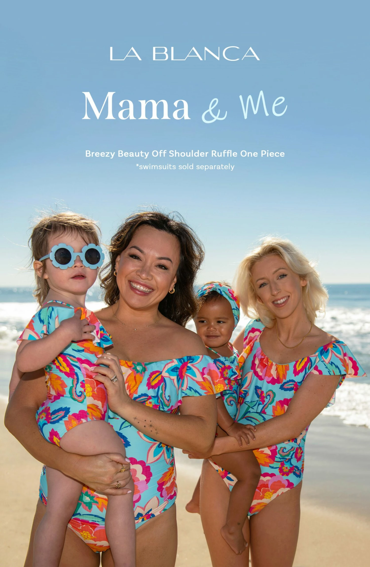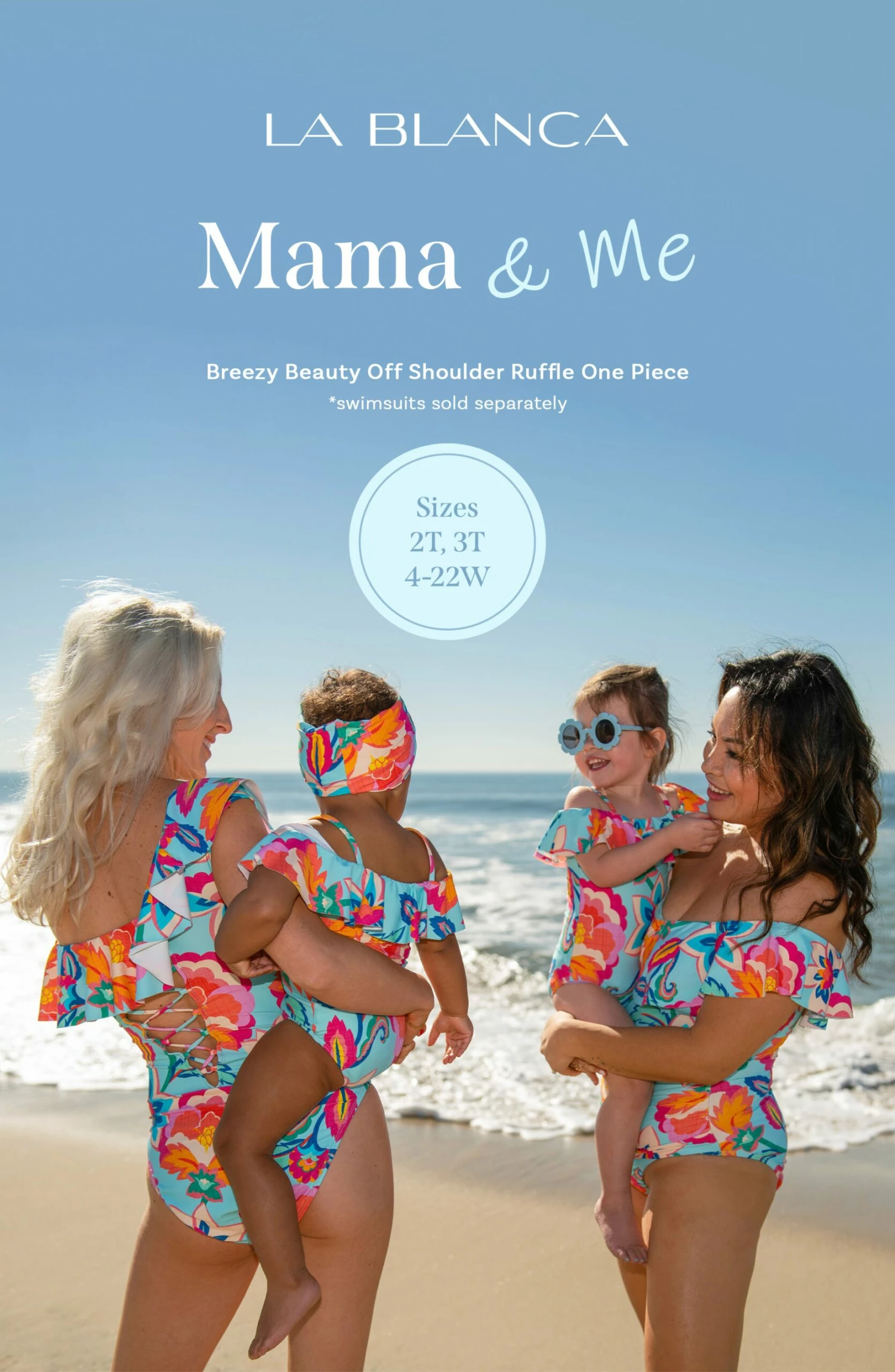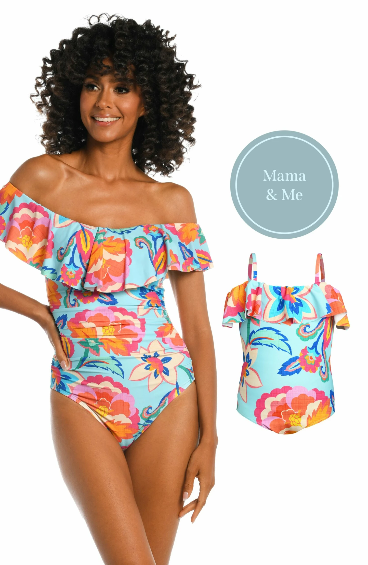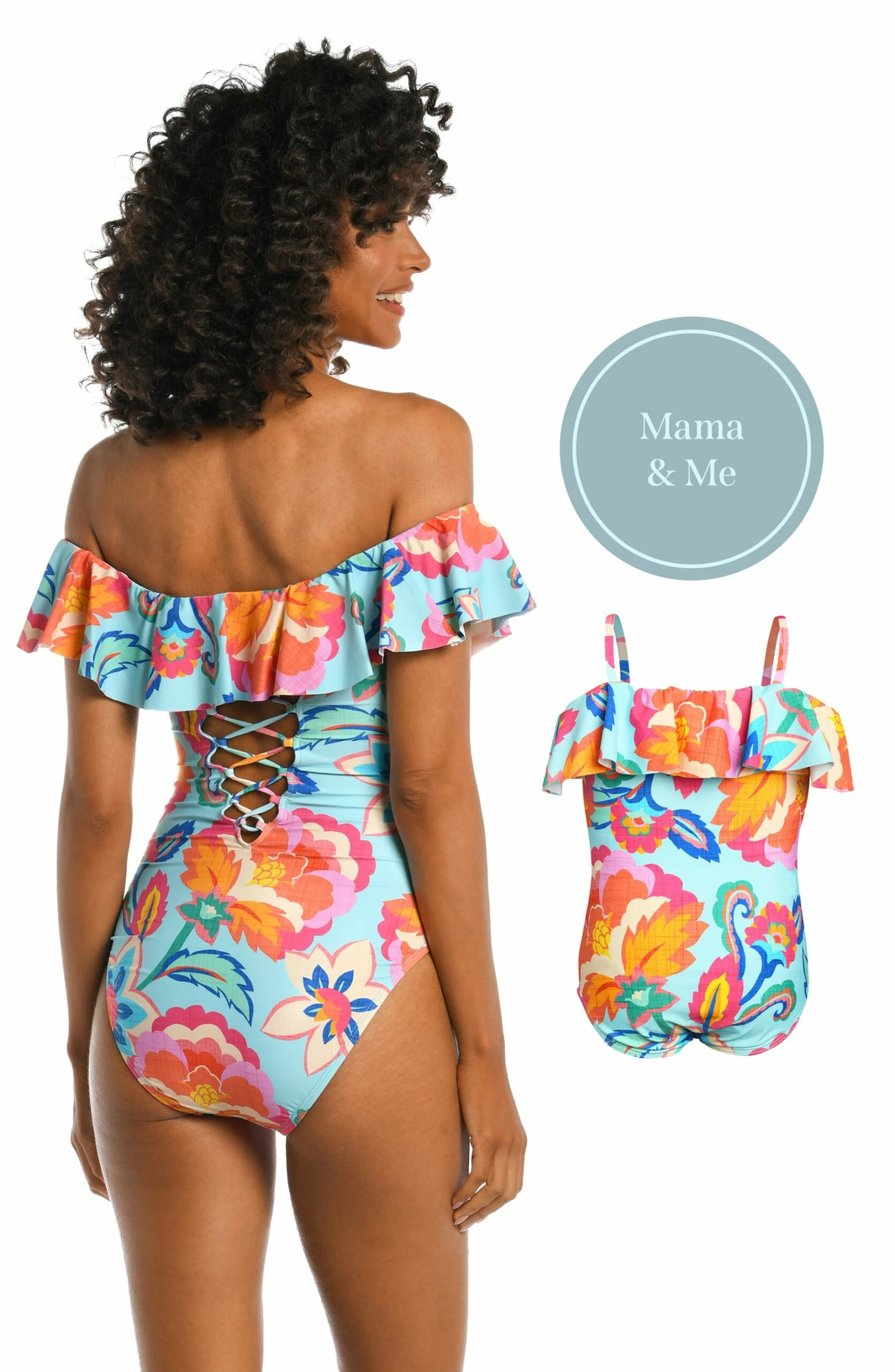 A light blue background provides the perfect backdrop for a profusion of tropical flowers on this one-piece suit. Perfectly pretty, the iconic off-the-shoulder silhouette with romantic ruffles draws the eye to your collarbone. The lace-up back reveals just a hint of skin for the perfect amount of sexy and coverage in the rear ensures this suit stays put.
