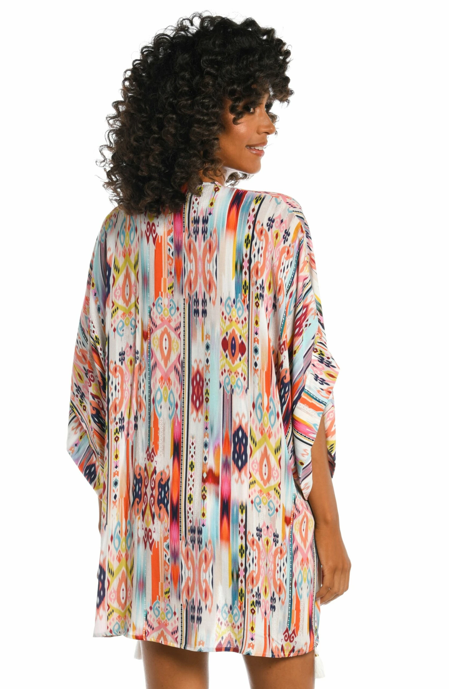 Turn up the heat in this kimono rendered in warm, desert-inspired hues with a dash of turquoise blue. It has a breezy, square cut design, a carefree open front and playful tassels on the sleeves and hem. While it’s the perfect piece to pair with your suit, this chic cover-up also makes a stylish statement when layered with a casual outfit for ship-to-shore ease.
