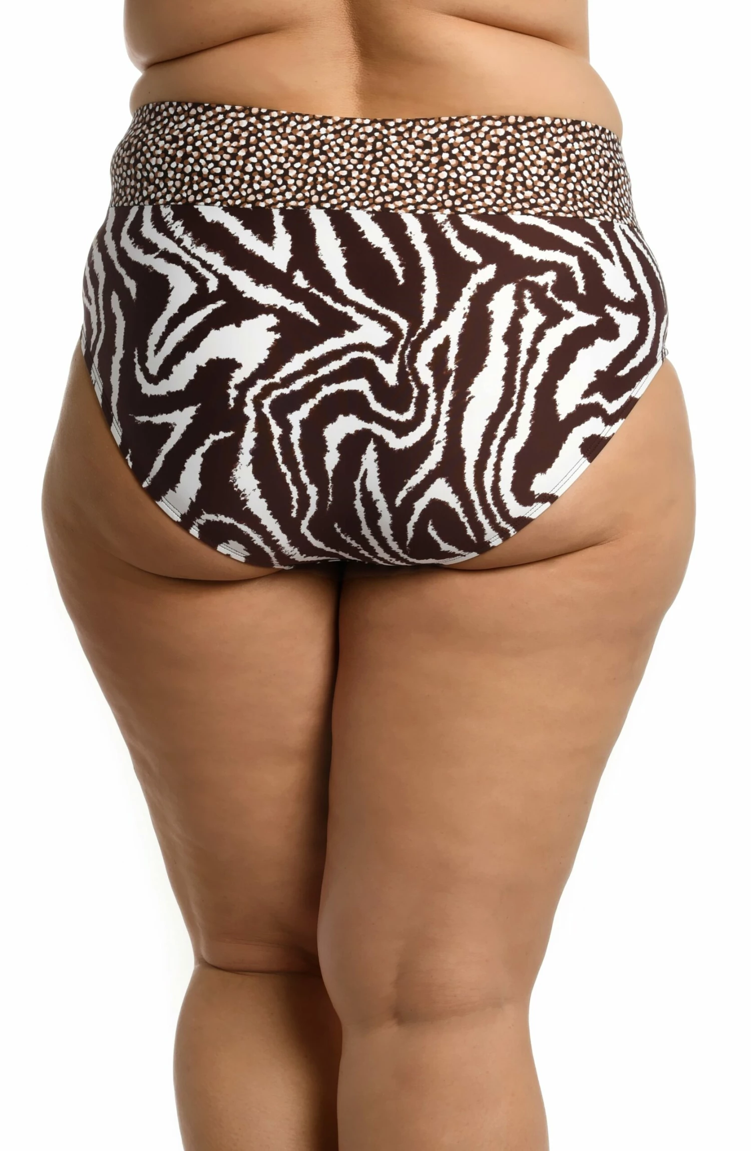 Something fierce, these resort-ready bikini bottoms prove that opposites attract in a contrasting animal-inspired print. The iconic silhouette has a glamorous, retro-inspired appeal featuring cheeky coverage in the back, the high waist and overlapping V-band instantly slim your midsection while lengthening the legs.