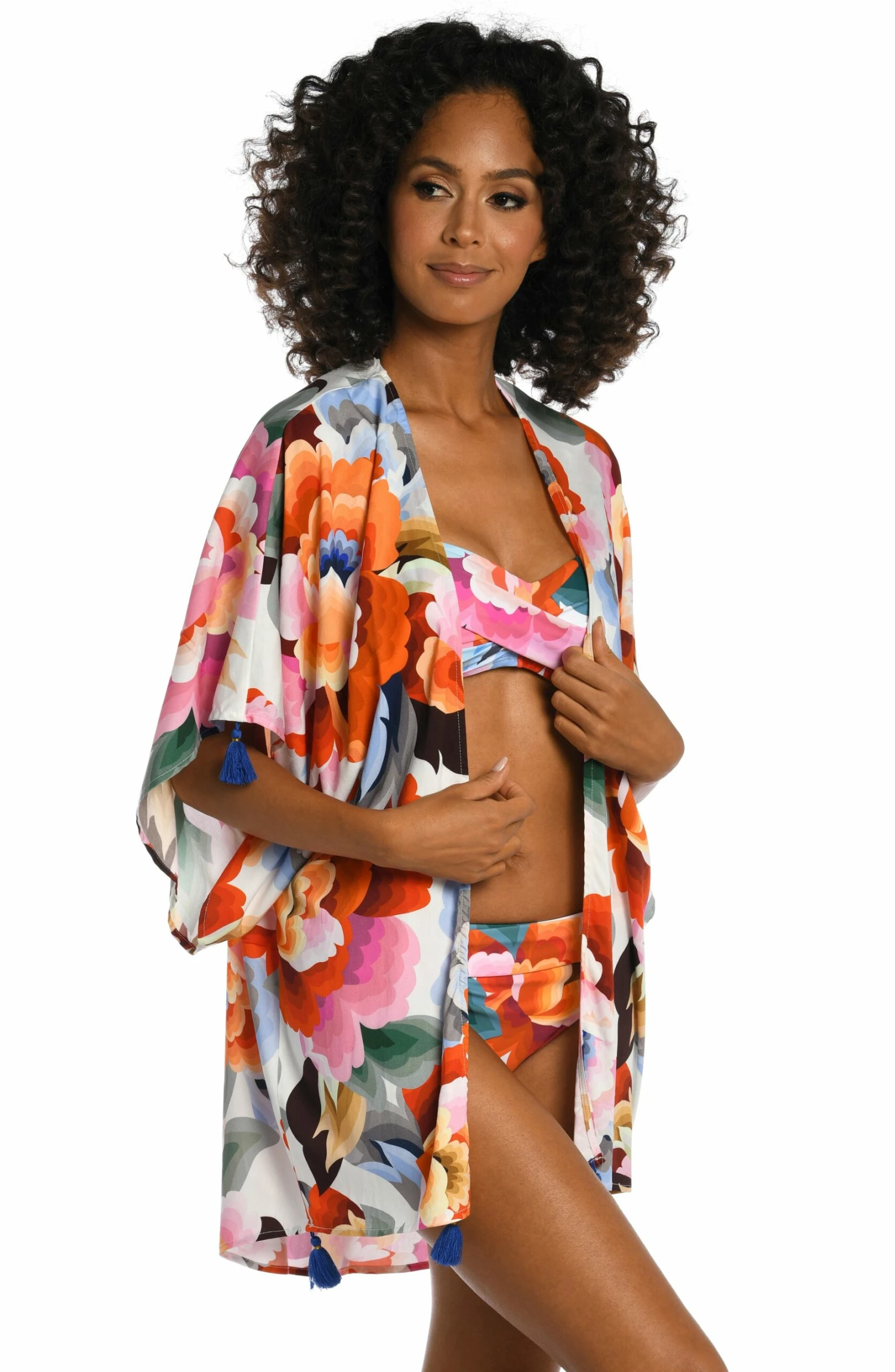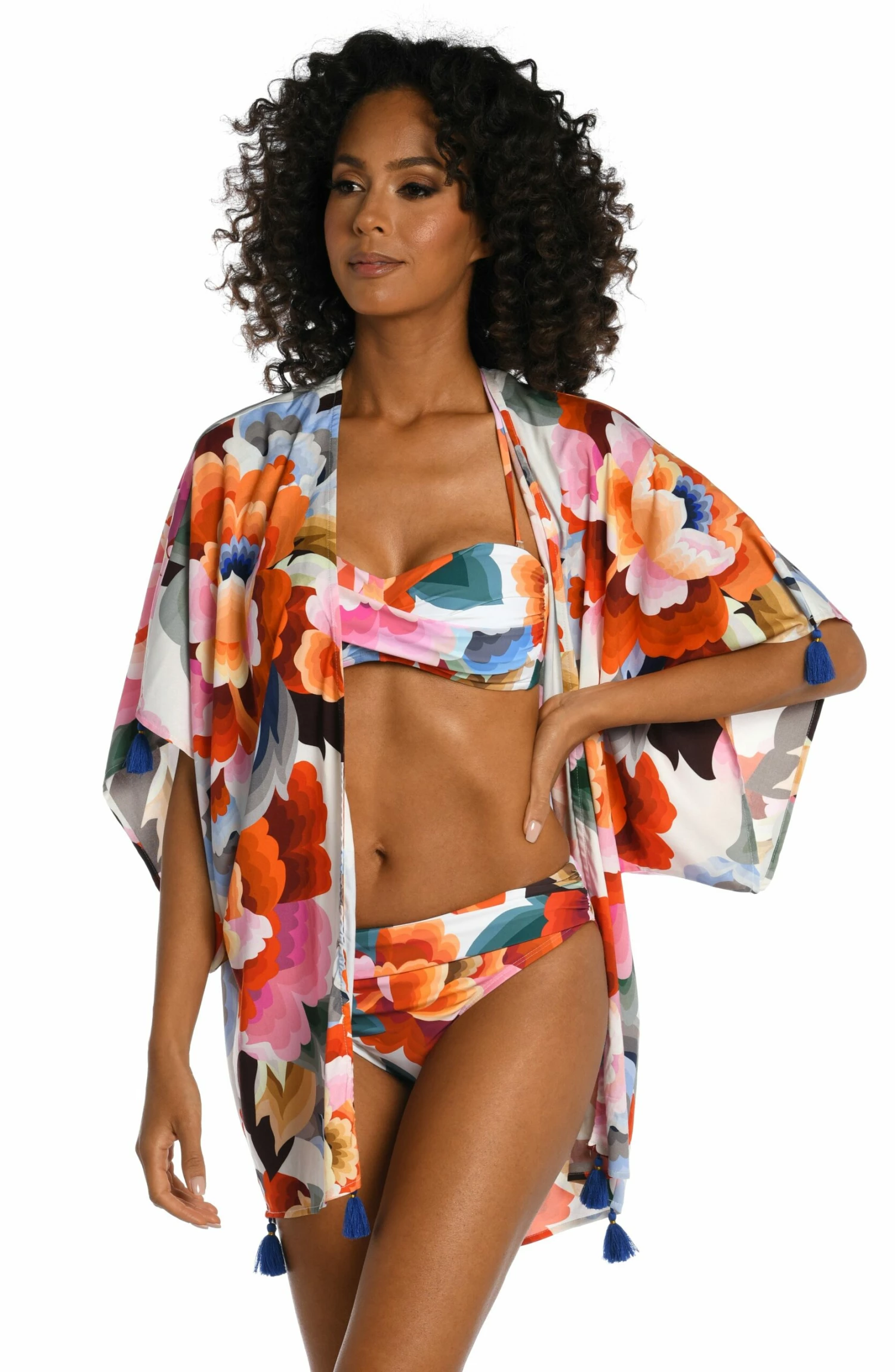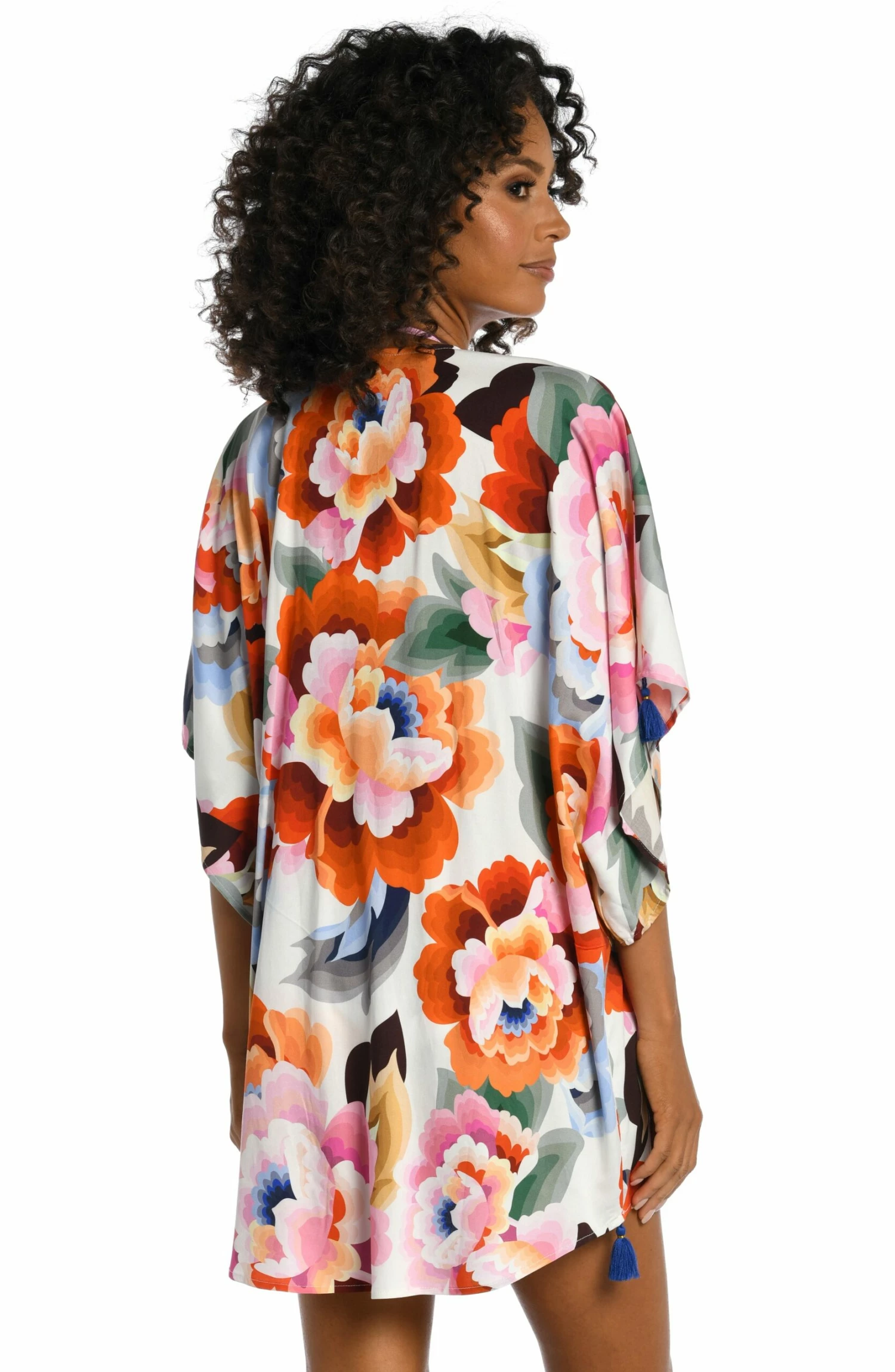 Get into the groove with this pretty kimono in a dreamy watercolor floral print. It has a breezy, square cut design, a carefree open front and playful tassels on the sleeves and hem. While it’s the perfect piece to pair with your suit, this chic cover-up also makes a stylish statement when layered with a casual outfit for deck-to-dinner ease.