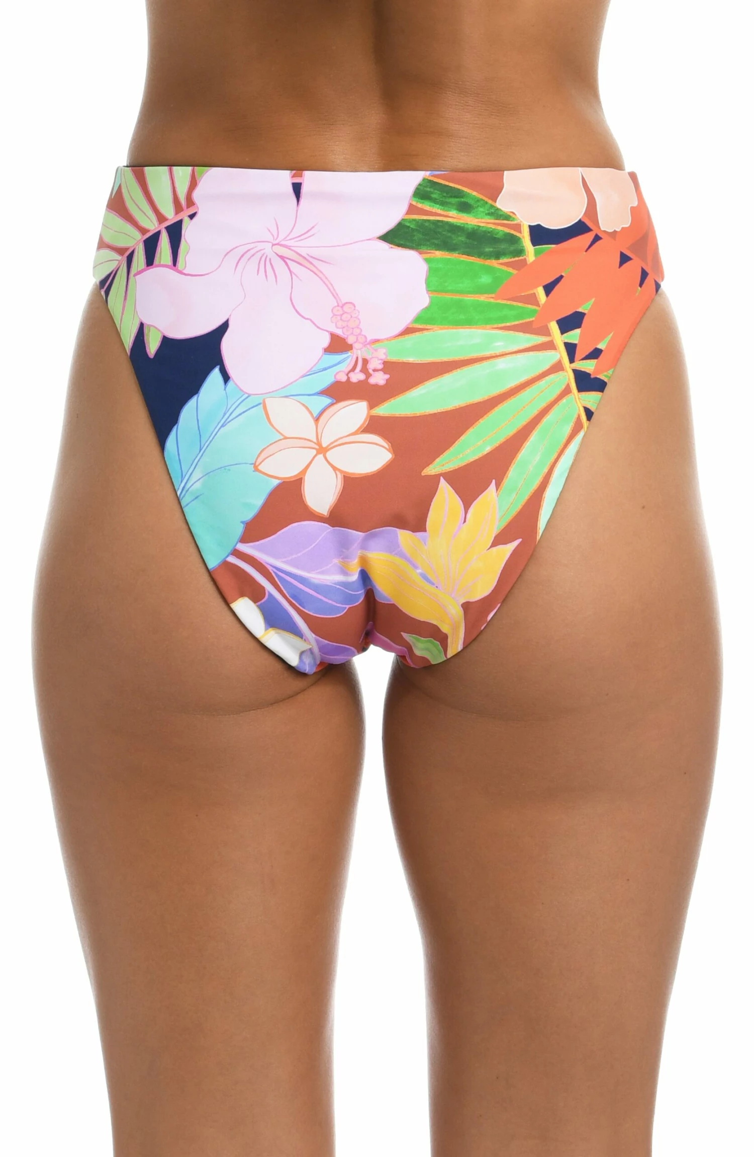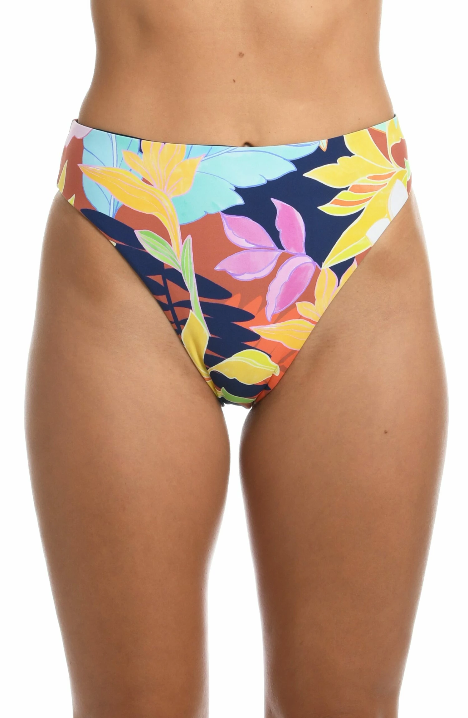 Hello, sunshine! These high-leg, high-waist bottoms pack a lot of punch – without taking up too much room in your suitcase – thanks to a reversible design. Solid blue on one side, a tropical print on the other – it’s just another day in paradise.