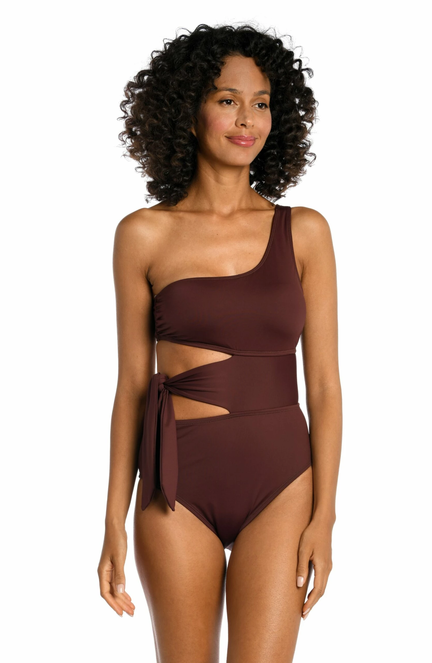 This one-piece suit gets a sexy update with a tie that wraps around the middle showing off just enough skin to be subtly seductive. The one-shoulder design brings balance to the neckline while instantly slimming the arms. Built-in tummy control and ample coverage in the rear give you the confidence you need to strut around the pool in sophisticated style.