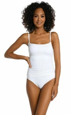 Sunbathe seaside in this lingerie one-piece swimsuit by La Blanca. The delicate and simple lingerie shape exudes a simple, feminine style. Adjustable straps and removable cups allow this piece to fit to you. Slimming fabric finishes the smooth, delicate look. Moderate rear coverage.