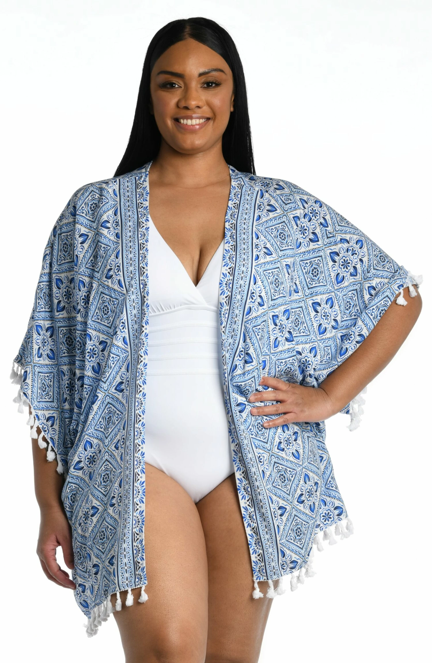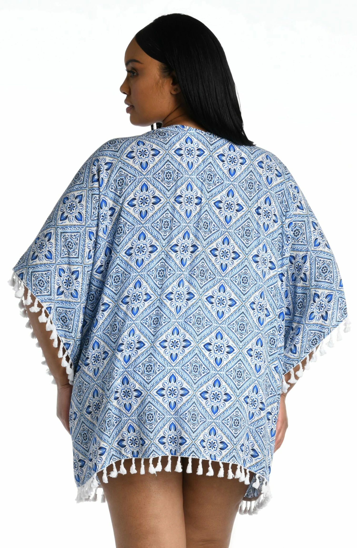 The artful mosaic on this kimono takes its cue from the azure blue waters of the Mediterranean. It has a breezy, square cut design and a casual open front for throw-on-and- go ease. Tassels at the sleeves and at the hem add a playful finishing touch. Pair with your suit or layer over a casual ensemble for statement-making style.