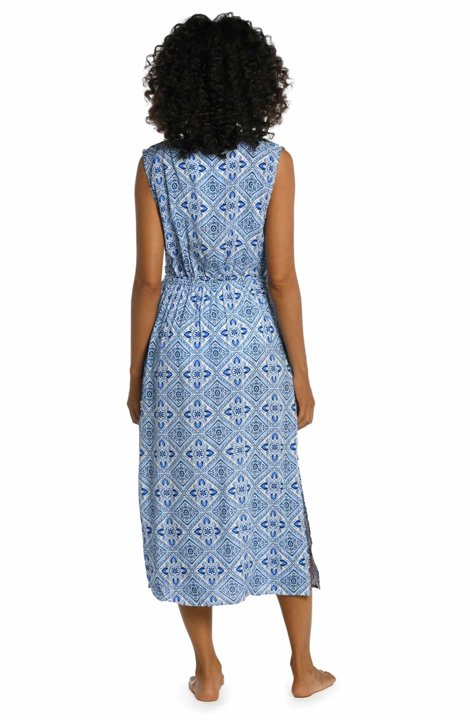 The artful mosaic on this dress takes its cue from the azure blue waters of the Mediterranean. Falling comfortably at a mid-length, it features a deep v-neck, drawstring waist and side slits for easy, breezy movement. Designed to cover up your swimsuit, we also love the versatility of pairing it with heals and bold jewelry for an evening out.