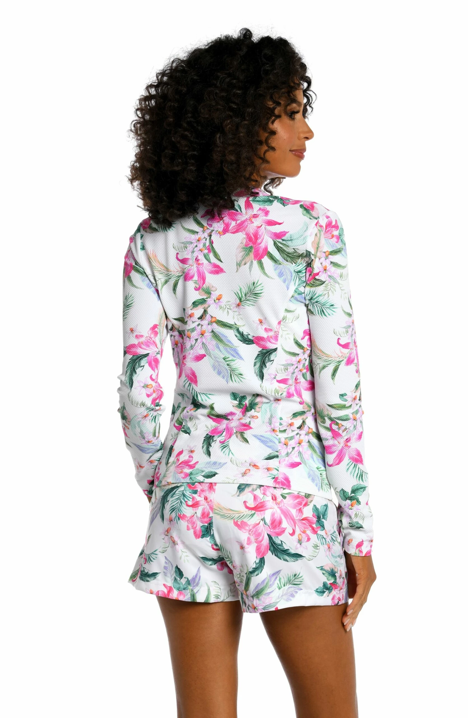 A tropical-inspired print in a pretty palette of pinks and greens brings a feminine touch to this sporty rashguard. From hopping waves on a jet ski to hiking to a swimming hole, this rashguard protects you from the harsh rays of the sun. A half zipper allows for extra coverage and easy ons and offs.