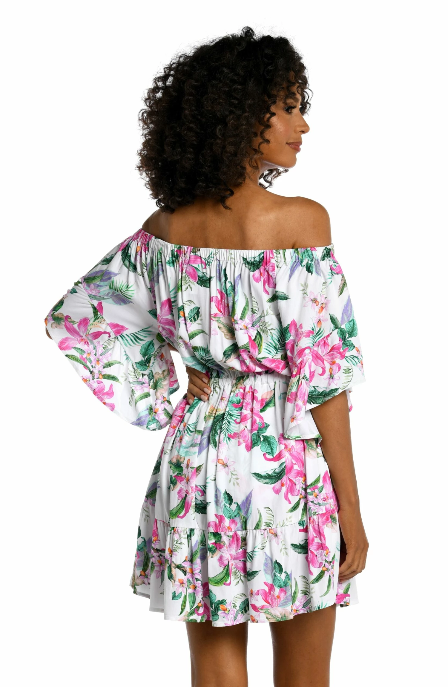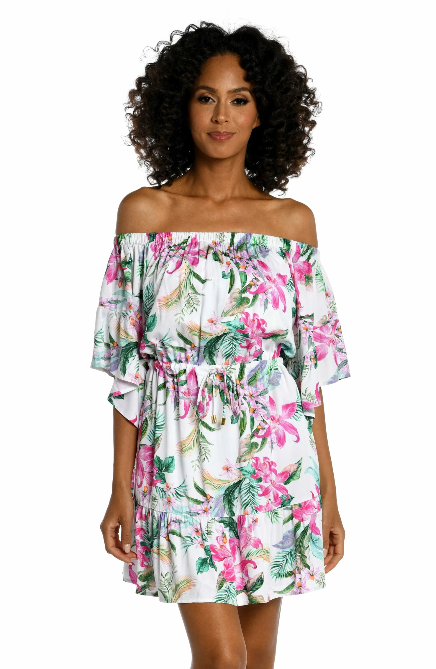 A pretty palette of pinks and greens brings a romantic touch to the tropical-inspired print on this dress. Universally flattering, the off-the-shoulder silhouette highlights your collarbone. Ruffled bell sleeves further enhance the feminine vibe, while a tie waist brings definition to your midsection.