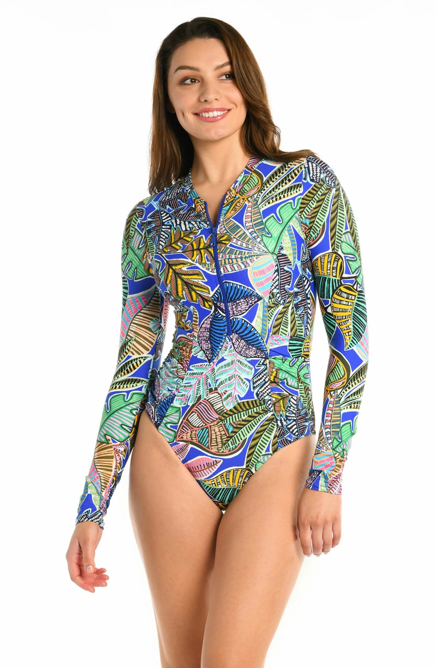 Adventure awaits! This stylish paddle suit is up for anything, whether wave hopping on a jet ski or catching some waves. A thick zipper makes it easier to put on and take off, while long sleeves keep you protected from the harsh rays of the sun. Gentle shirring masks worry areas for a shape-slimming silhouette.