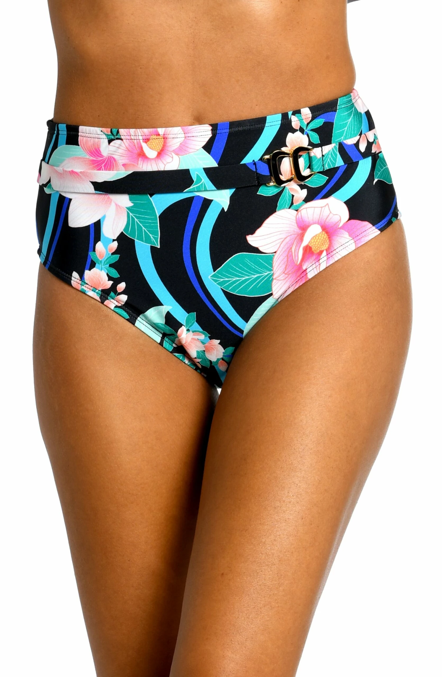 Destination paradise. The beautiful blooms set against a black background on these bikini bottoms bring to mind a moonlit stroll along a sandy beach. The iconic high-waist design has a glamourous retro-inspired vibe that lets you show off your curves with confidence. Built-in tummy control instantly trims and tones, while moderate coverage in back ensures these bottoms stay firmly in place.