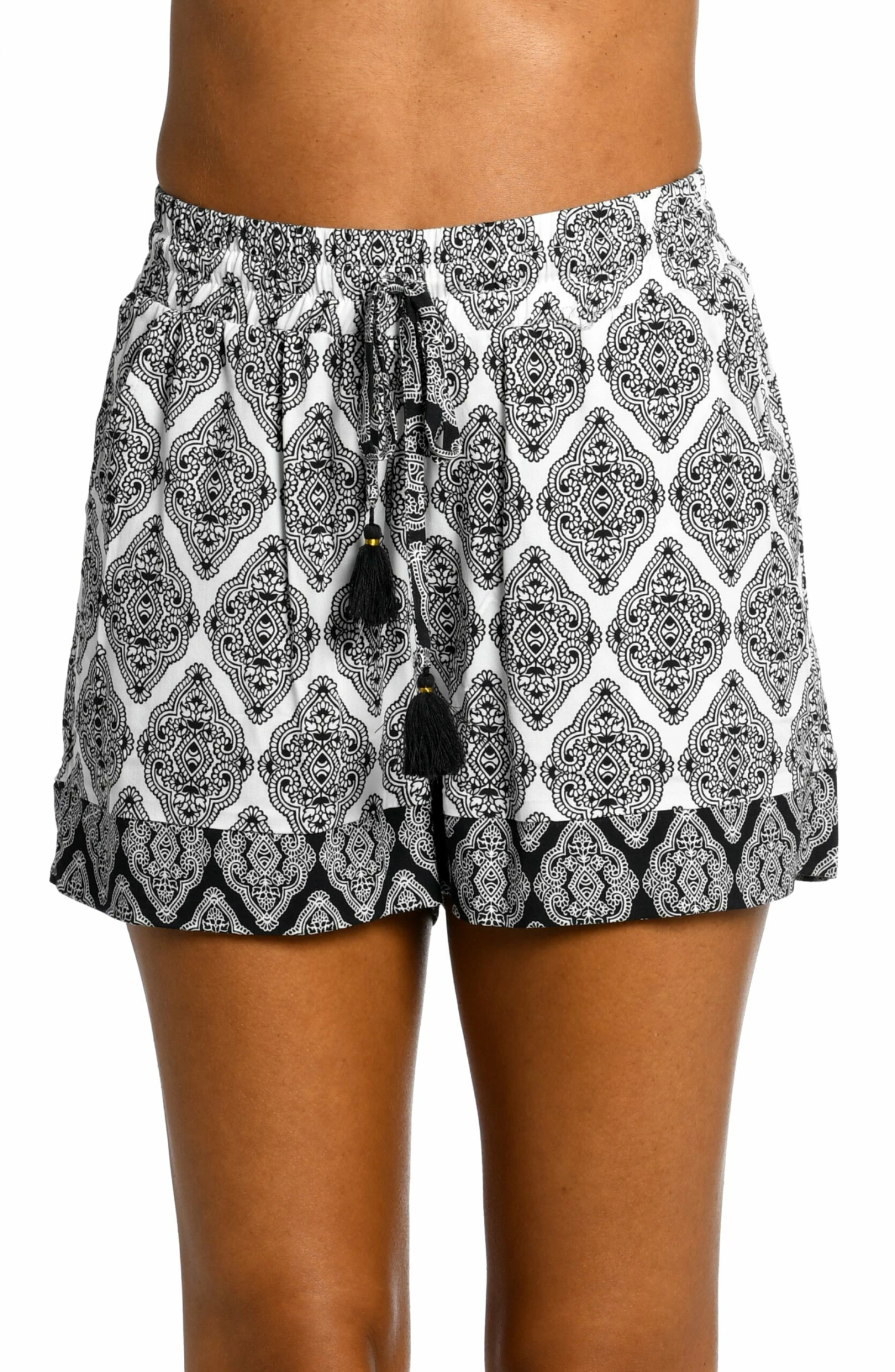 Pure paradise, these beach shorts offer up plenty of graphic punch with a high-contrast black-and-white motif. A gently elasticized drawstring waist tipped with tassels makes for easy ons and offs — the perfect throw-on-and-go choice for wearing over your swimsuit.