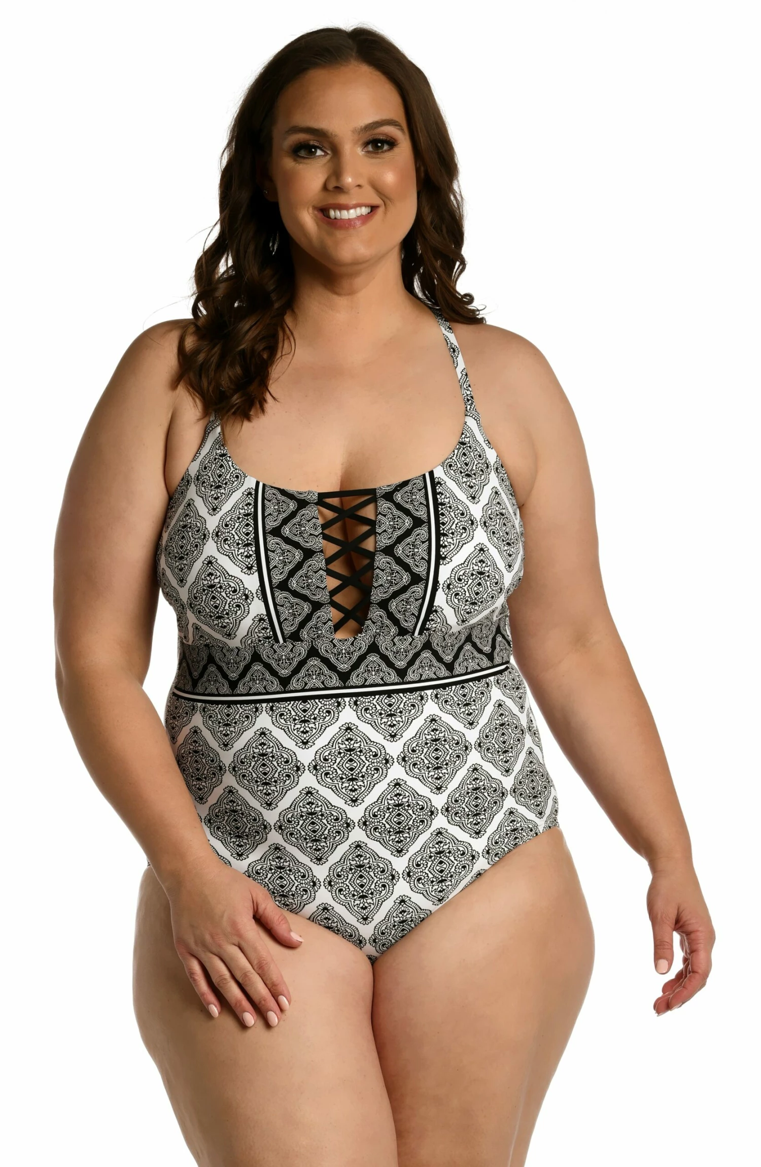 Pure paradise, this sexy one-piece suit offers up plenty of graphic punch with a high-contrast black-and-white motif. A scooped neckline with crisscross ladder details shows off seductive hints of skin, while built-in tummy control smooths and slims for a confident fit. The adjustable straps that crisscross in back convert for two looks in one design.