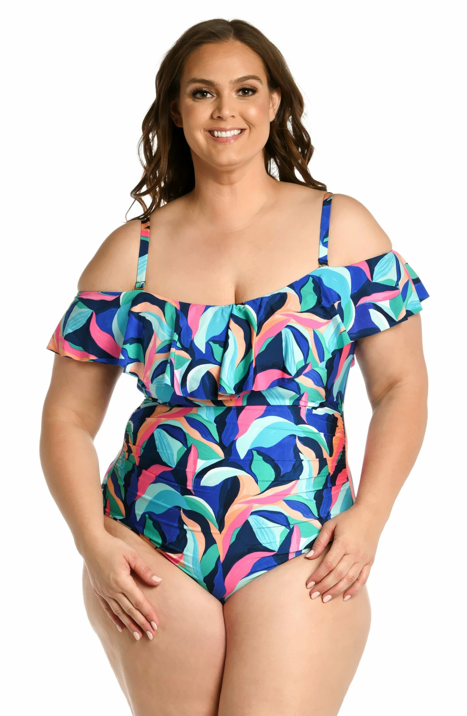 Paint-like strokes in bold, brilliant hues create the gorgeous leaf pattern on this one-piece suit. A romantic off-the-shoulder silhouette with feminine ruffles draws the eye to your collarbone, while lace-up back detail adds that little something extra. A slim fit and moderate coverage in the rear offers worry-free wear.