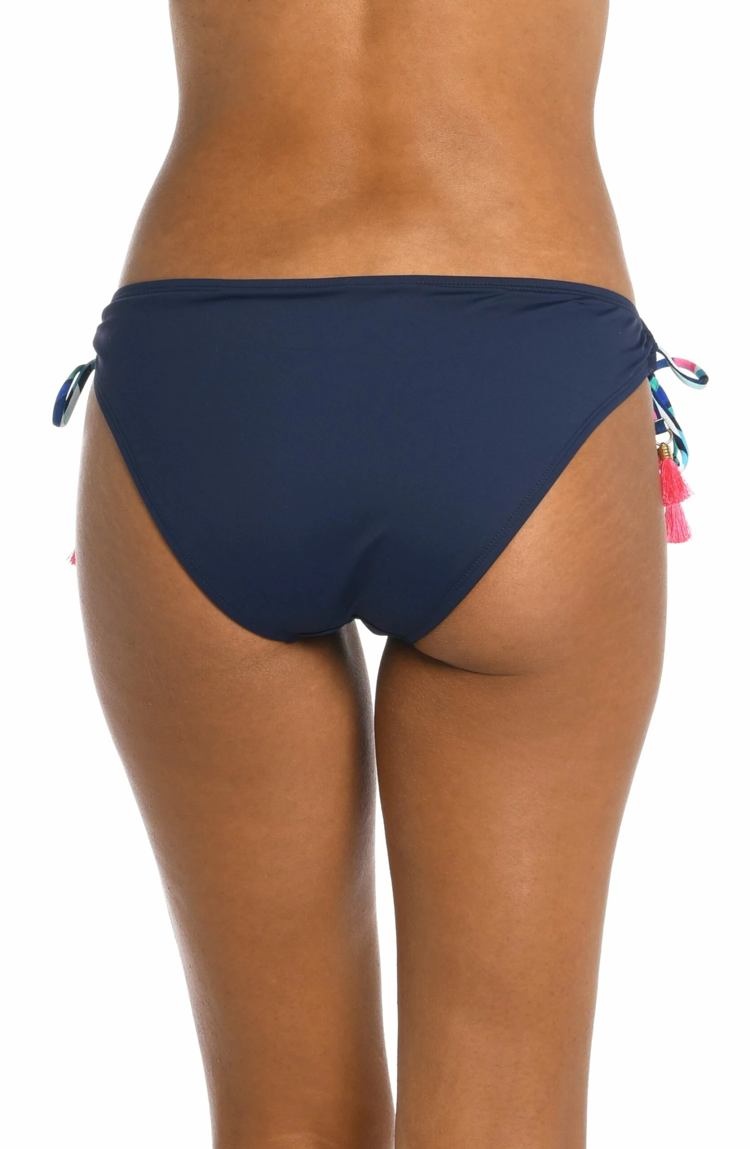 An indigo ground provides the perfect canvas for the paint-like strokes of bold, brilliantly colored trim on these swim bottoms. Adjustable side tie loops tipped with pink tassels reveal just a hint of skin and the hipster cut flatters the hips. Ample rear coverage allows you to move around freely and comfortably, without having to worry about exposing more than you want to.