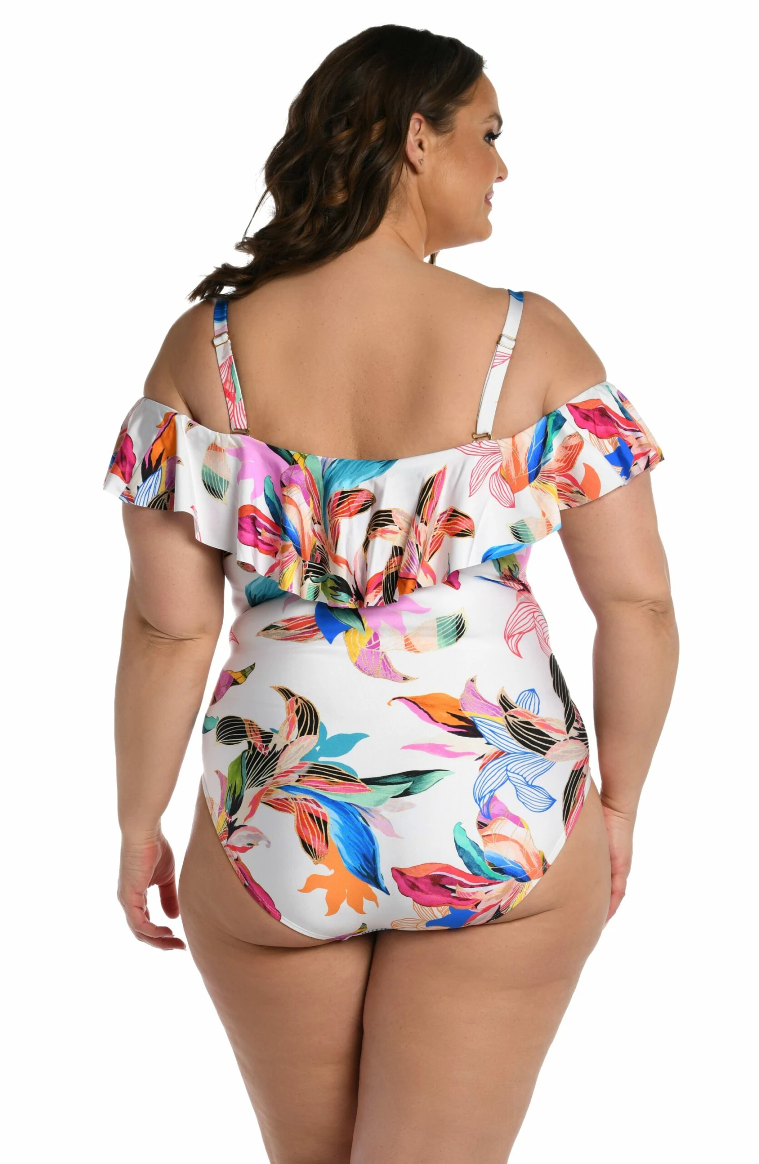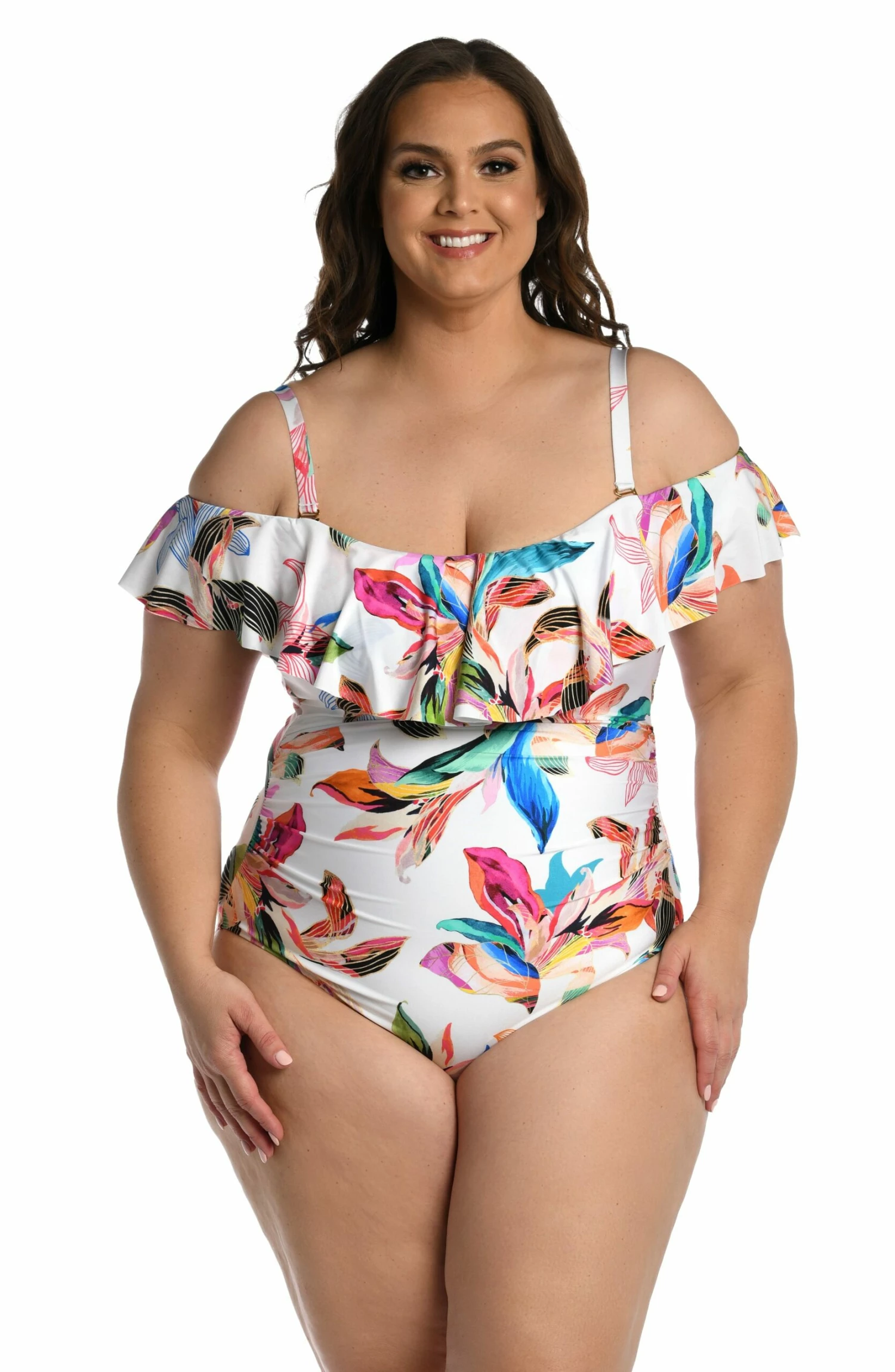It’s just another day in paradise when you slip on this one-piece suit in a dreamy tropical-inspired print. Radiating iconic style, it features an off-the-shoulder silhouette and romantic ruffles that draw attention to your collarbone. A slim fit, gentle ruching and moderate coverage in the rear offers a confident, carefree fit.