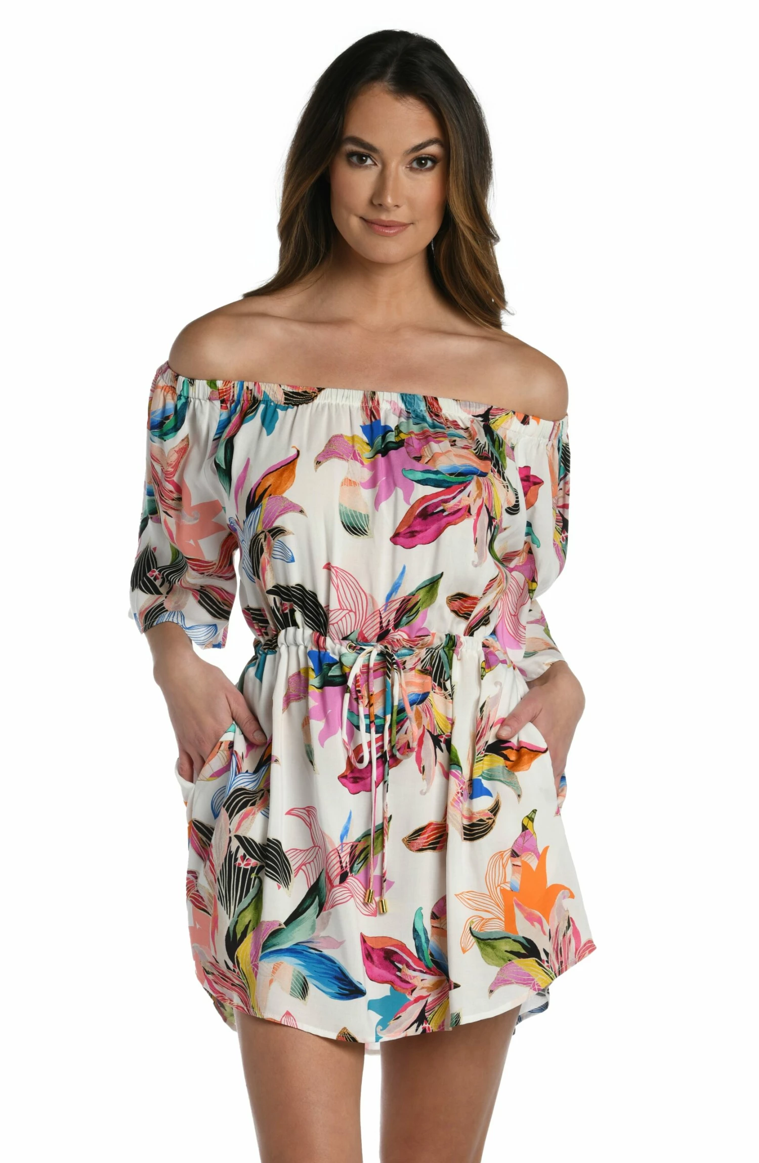 It’s just another day in paradise when you slip on this off-the-shoulder dress in a dreamy tropical-inspired print. Offering just the right amount of coverage, this resort-ready cover-up is styled with breezy bell sleeves and a drawstring waist that defines your midsection.