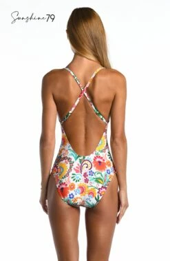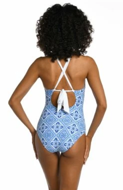 This dual aqua blue and leopard print swimwear design combines the classic leopard print with a fresh and modern twist, featuring shades of aqua blue and teal for a cool and refreshing look. Beautifully balanced, the contrasting print border beneath the sexy v-plunge neckline define your waist and a built-in tummy control panel smooths and slims. The fixed multi-strap cross-back design keeps everything neatly tucked in.