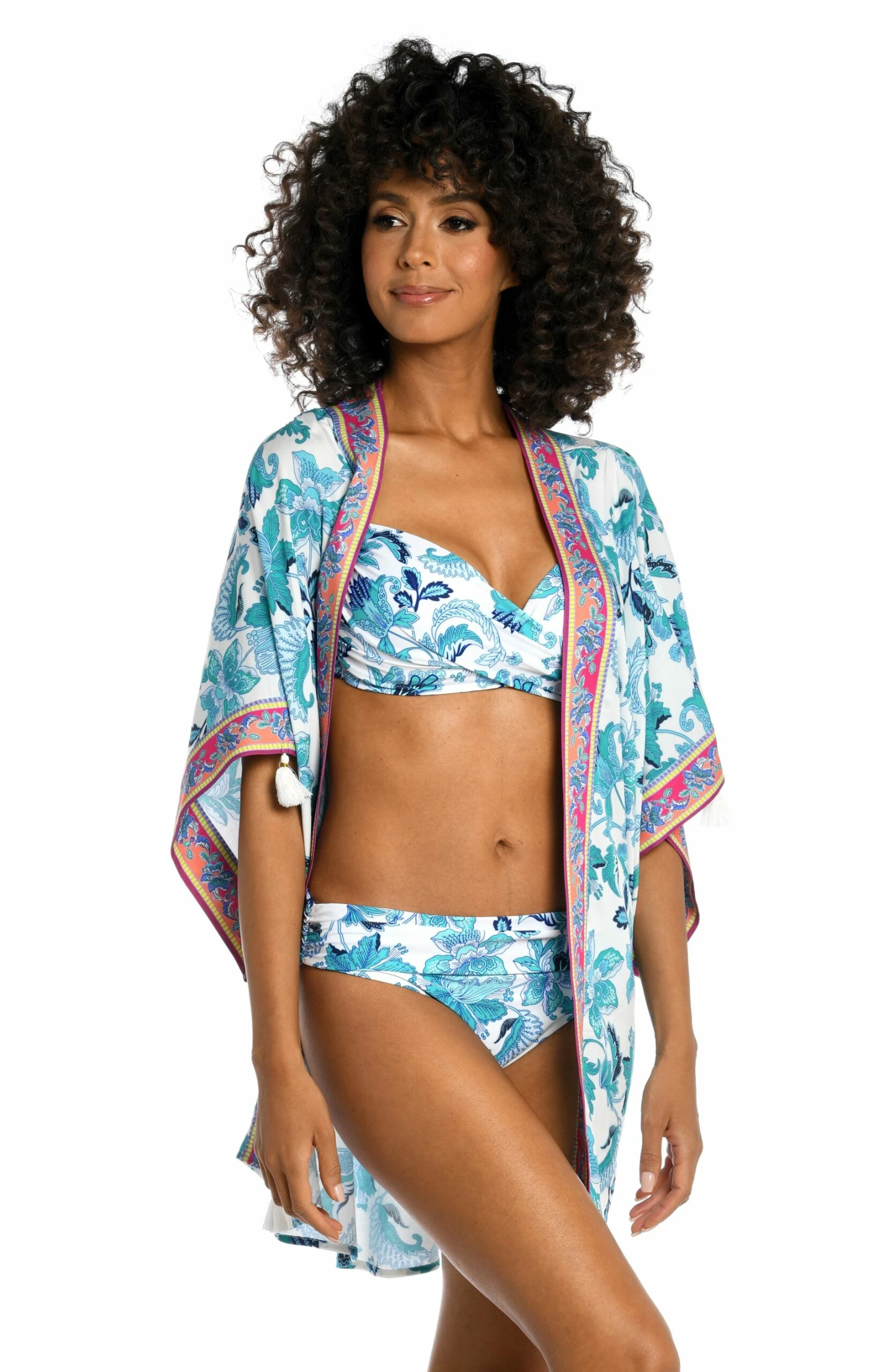 Famed for its gorgeous sunsets that melt into the Aegean Sea, Santorini was the inspiration behind the design and colors on our kimono. It has a breezy, square cut design, a carefree open front and playful tassels along the sleeve openings and hem. While it’s the perfect piece to pair with your suit, this chic cover-up also makes a stylish statement when layered with a casual outfit for beach-to-brunch ease.