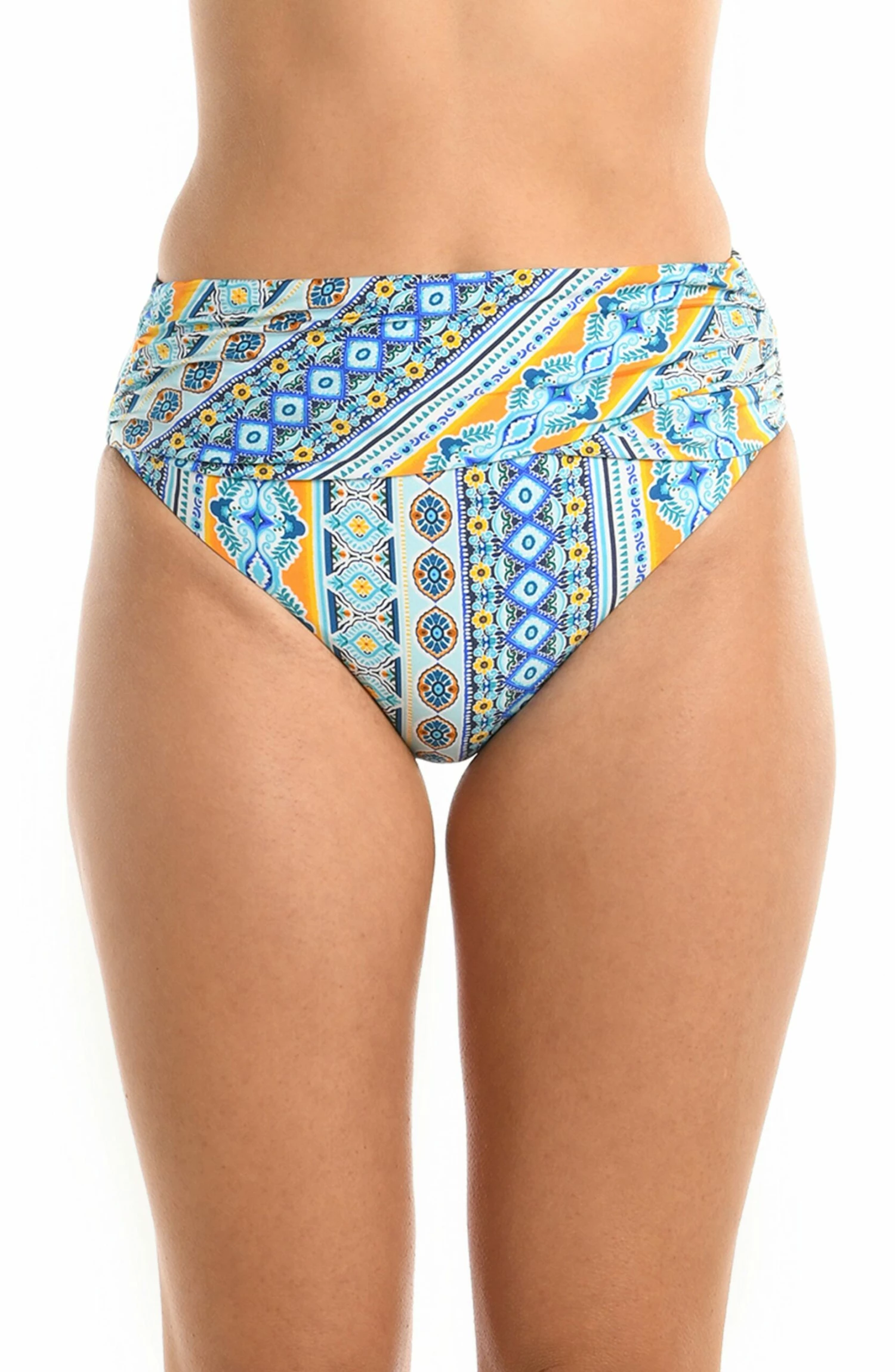 This blue tonal Mediterranean swimwear design is inspired by the crystal-clear waters of the Aegean Sea, featuring varying shades of blue in a gradient pattern. We love the way these mid-waist bottoms provide a little extra coverage yet still manage to look super sexy. Overlapping sash bands, built-in tummy control and moderate coverage in back give you all the confidence you need to hit the beach running.