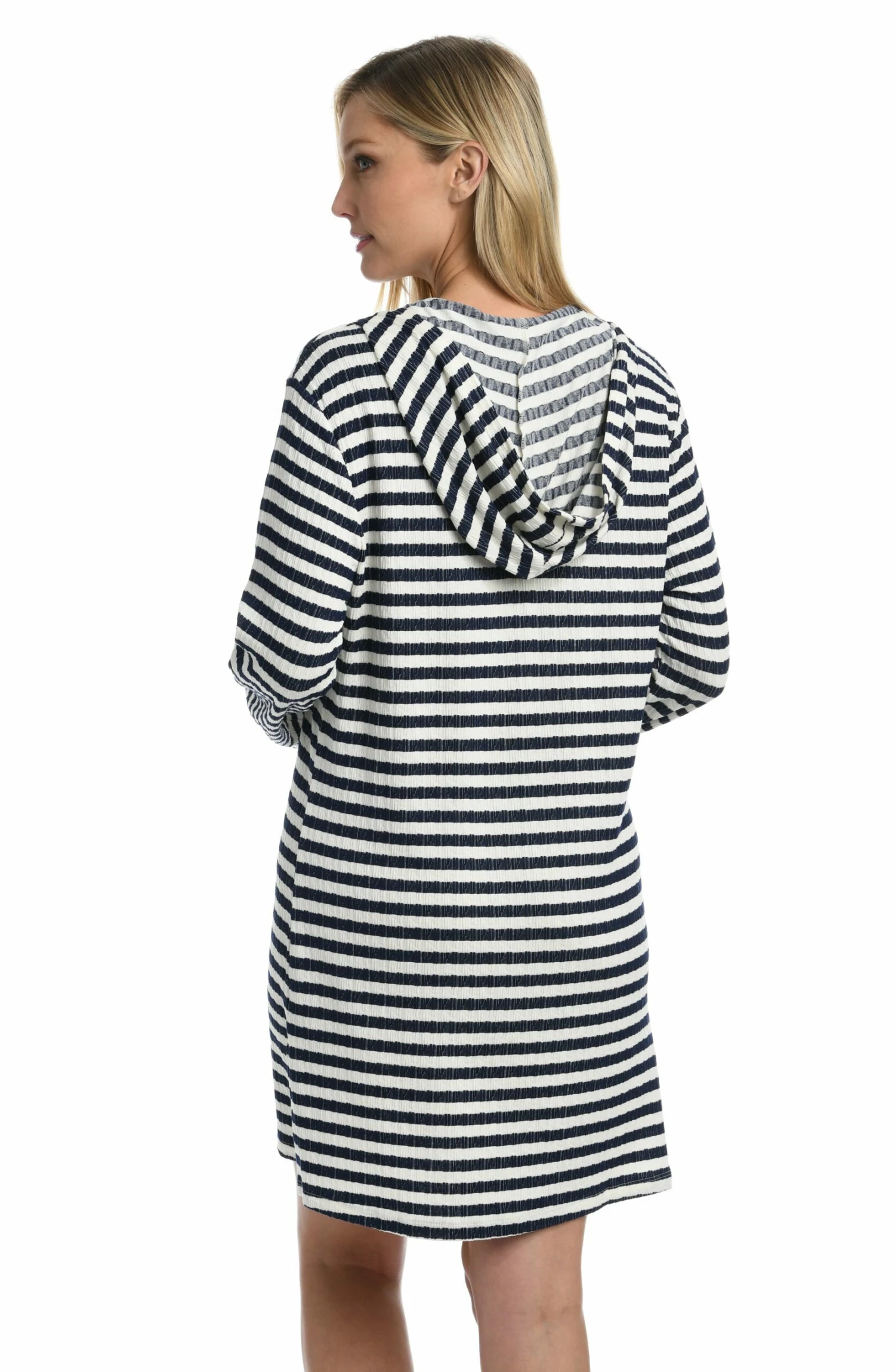 Anchor your look in classic white and indigo stripes with our nautical-inspired tunic. Offering just the right amount of coverage, this cruise-ready cover-up is styled with a v-neck lace-up front, pockets and long sleeves that provide a light layer of warmth when cozying up after a dip.
