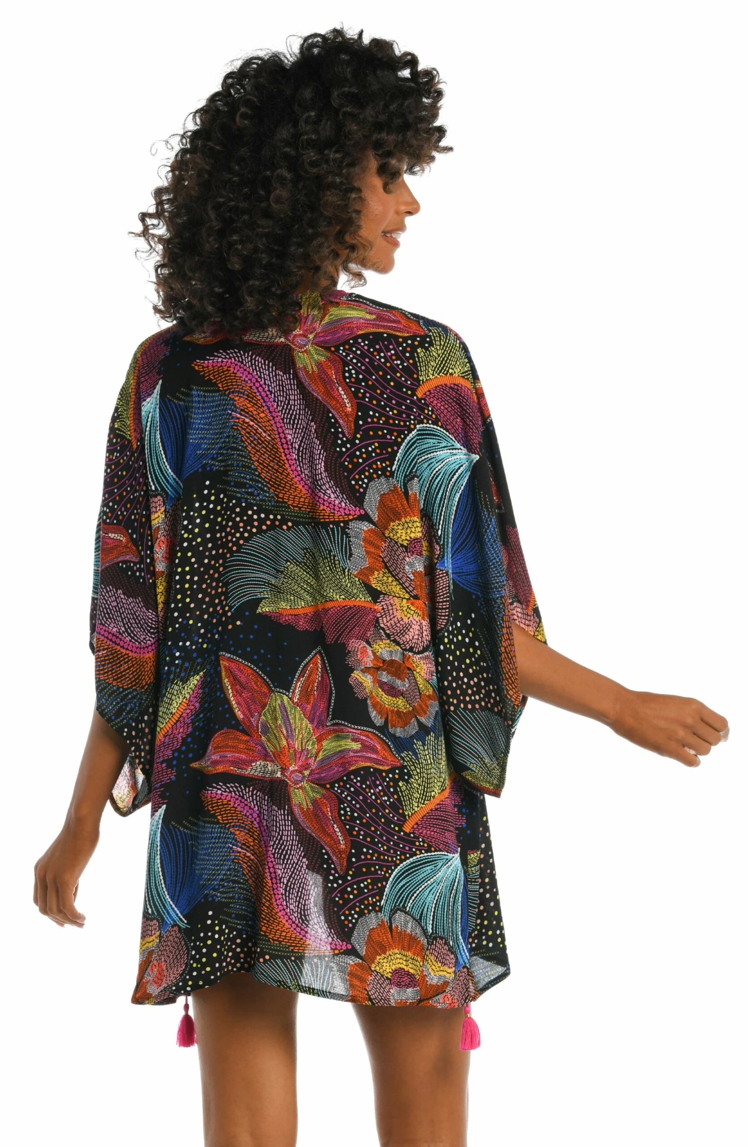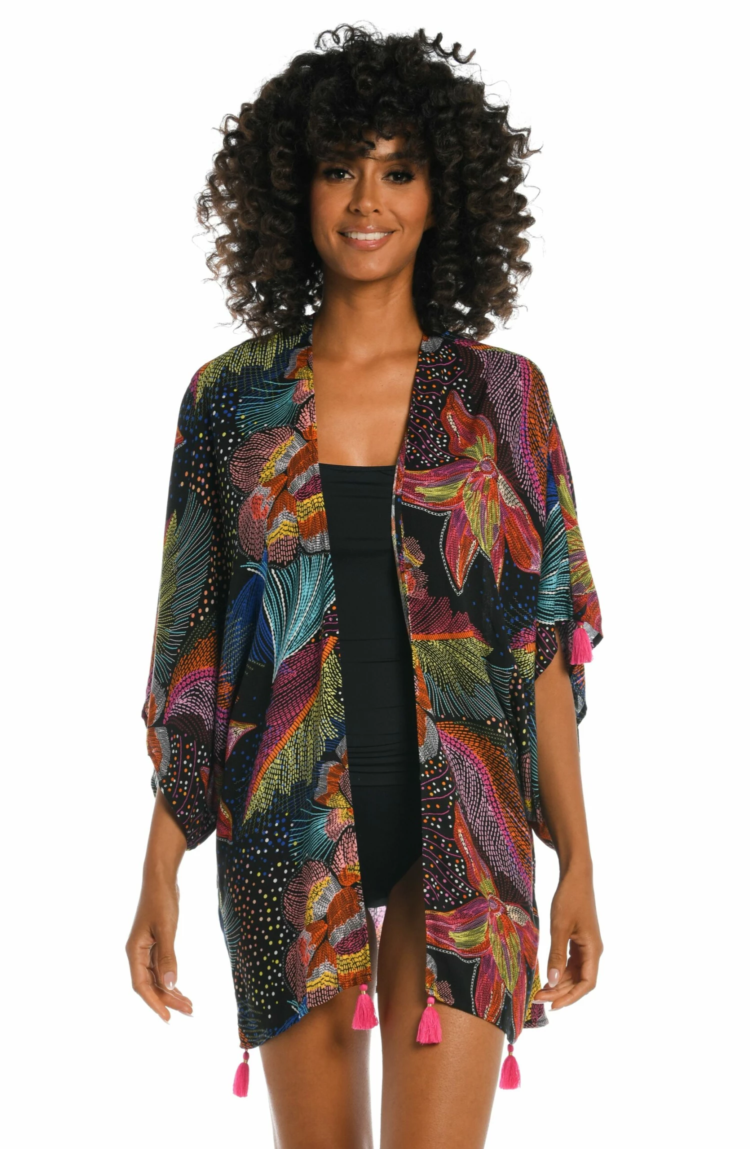Make every hour the golden hour with this supremely stylish kimono in dappled sunlit shades. It has a breezy, square cut design, a carefree open front and playful tassels on the sleeves and hem. While it’s the perfect piece to pair with your suit, this chic cover-up also makes a stylish statement when layered with a casual outfit for sea-to-shore ease.