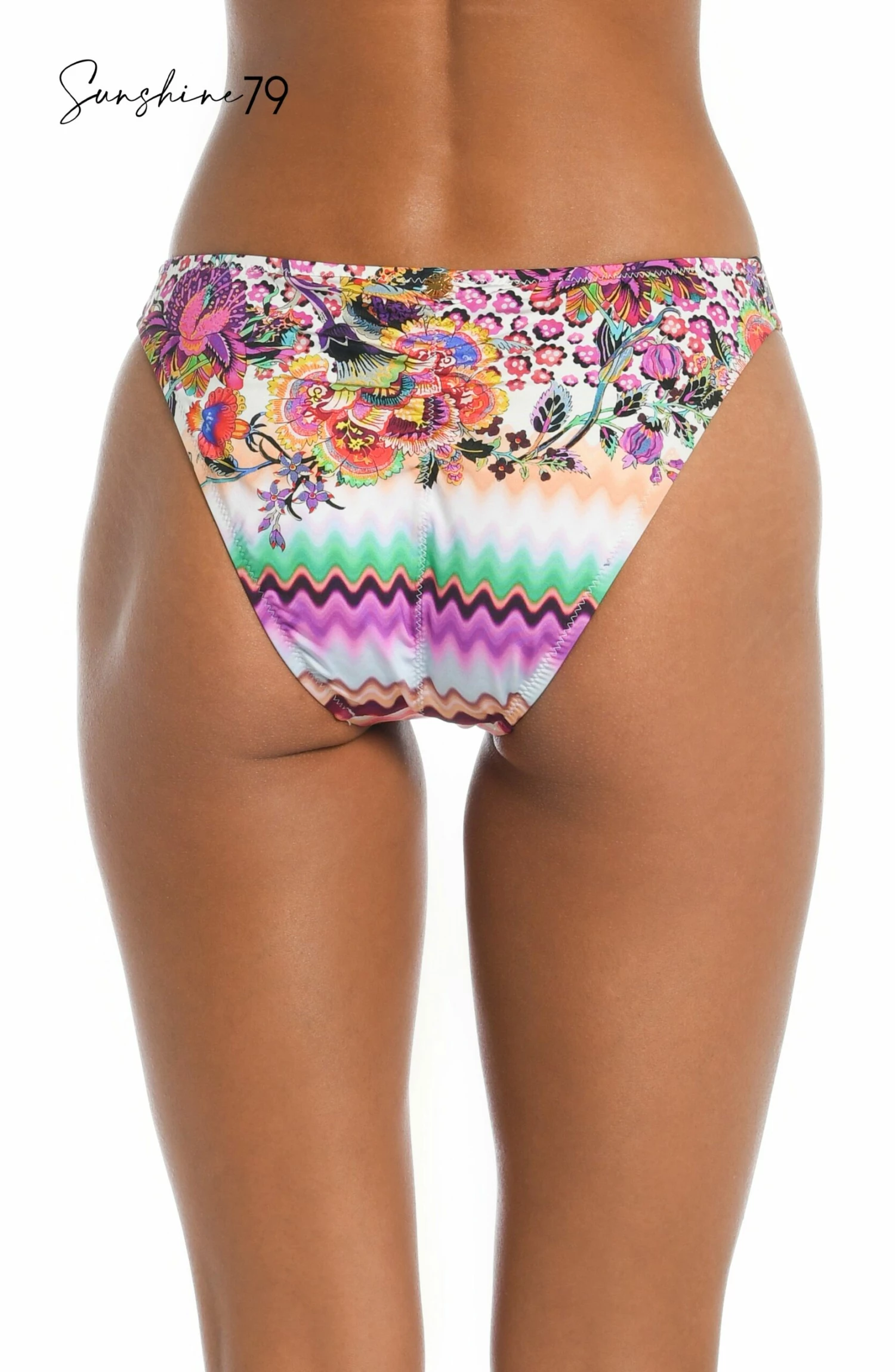These festival-ready bikini bottoms by Sunshine 79 are the life of the party with a popping floral print and playful zigzagging stripes. Universally flattering, the defining factor on these French-cut beauties is a high-rise, hip-revealing silhouette that creates the illusion of longer legs. Contemporary coverage in back keeps the look sophisticated.