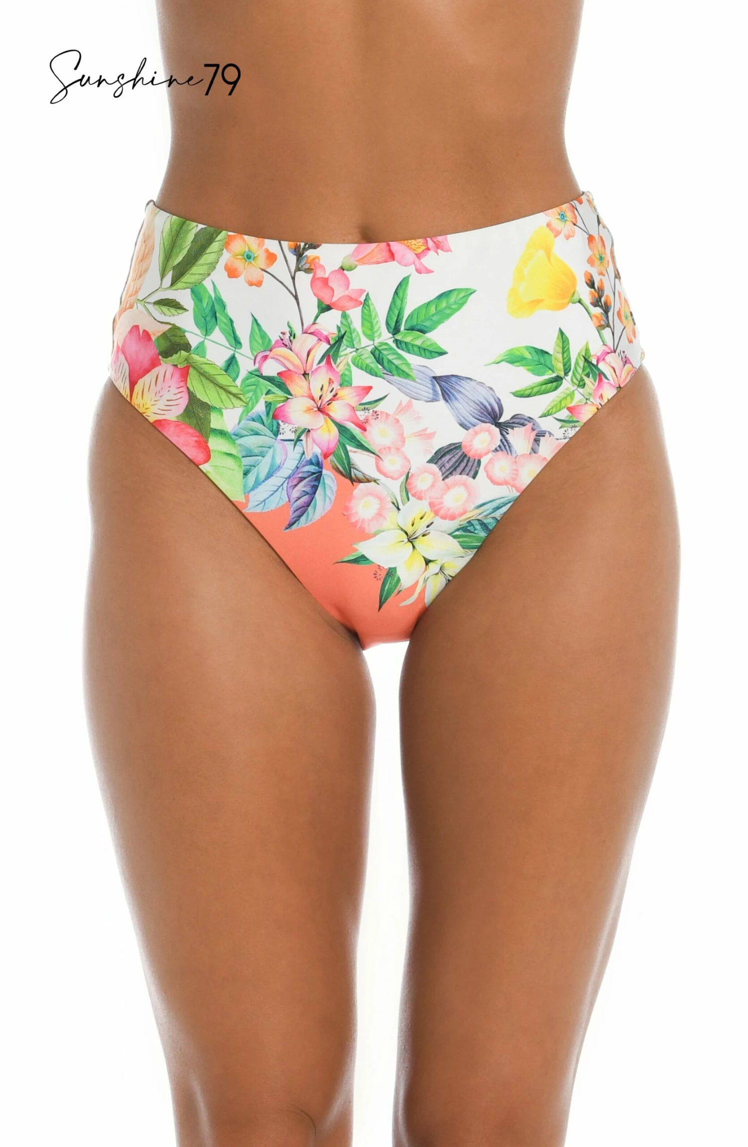 A garden’s worth of flowers blooms against a yummy creamsicle shade of coral orange on these swim bottoms by Sunshine 79. The iconic, high-waist design visually lengthens the legs while nipping the waistline in. Moderate coverage in back keeps the look sophisticated.