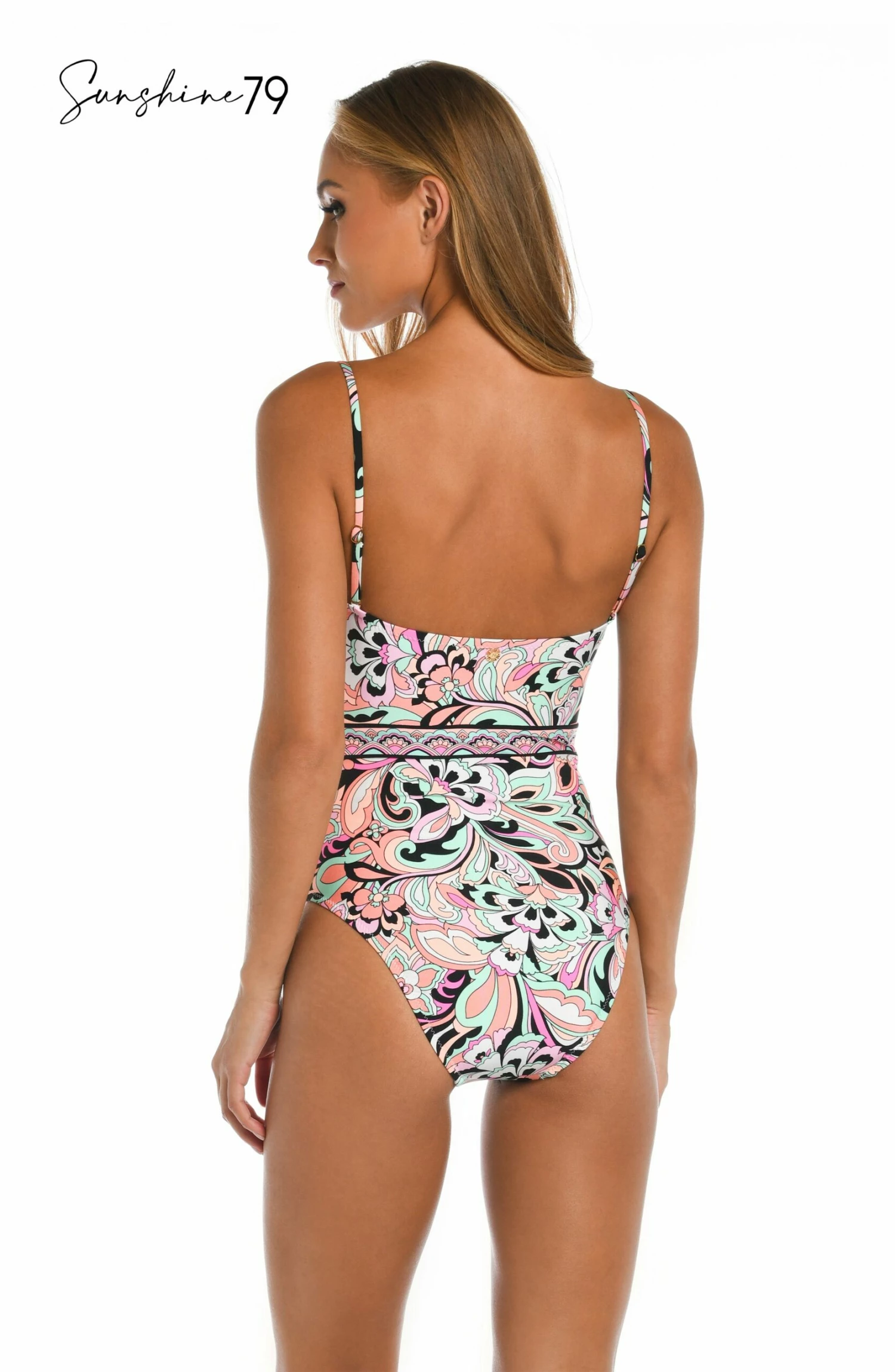 Perfect in paisley, the design on this one-piece suit by Sunshine 79 takes shape in gorgeous shades of coral, pink and seafoam green. Offering two looks in one, this sexy suit transitions to a bandeau by removing the shoulder straps. Built-in cups keep you feeling lifted with or without the straps. Detail we love: gold beading that gathers the bodice in the center.