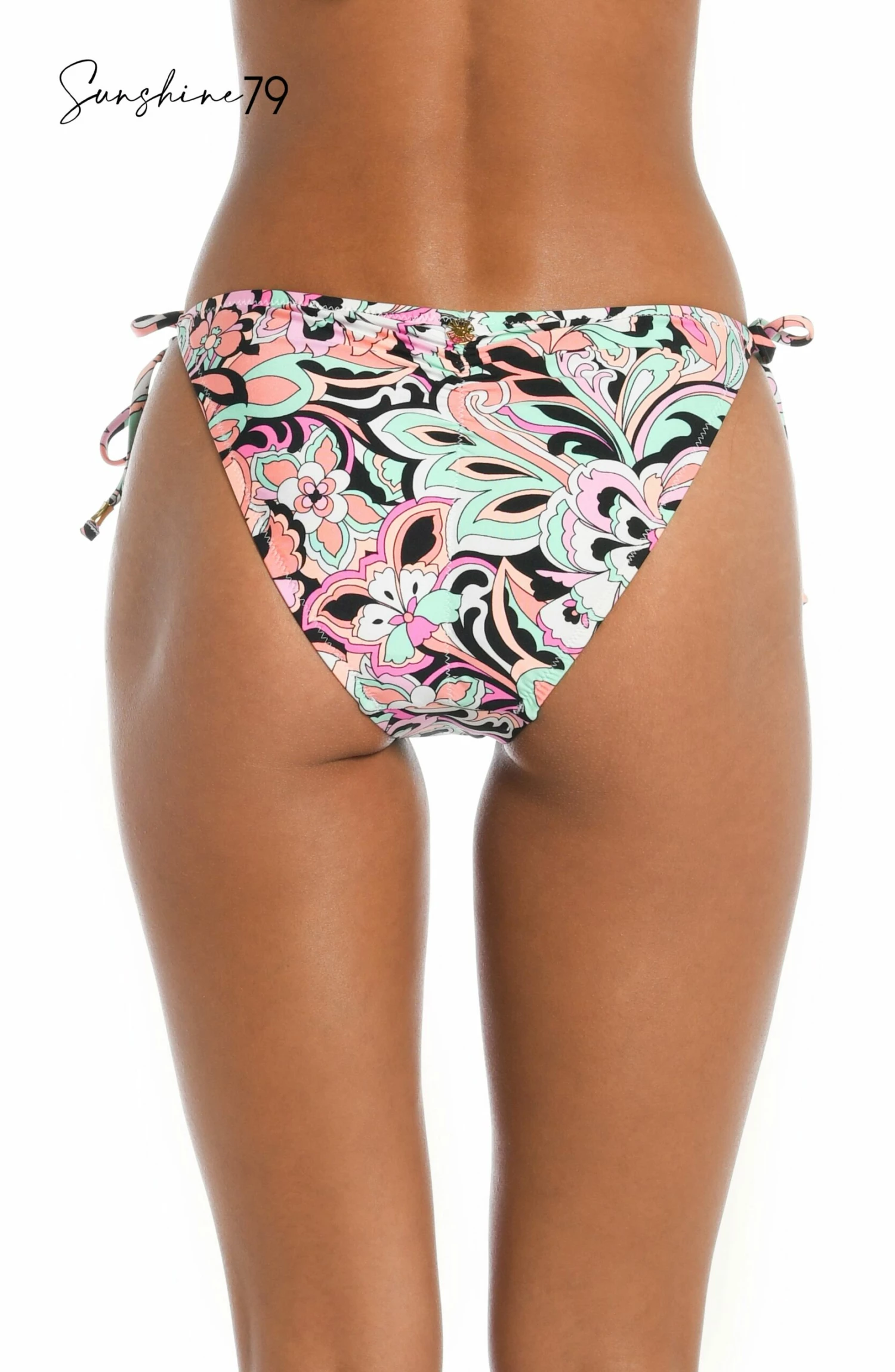 Perfect in paisley, the design on these bikini bottoms by Sunshine 79 takes shape in gorgeous shades of coral, pink and seafoam green. String side ties tipped with gold beads flatter the hips while contemporary coverage in back highlights your derrière.