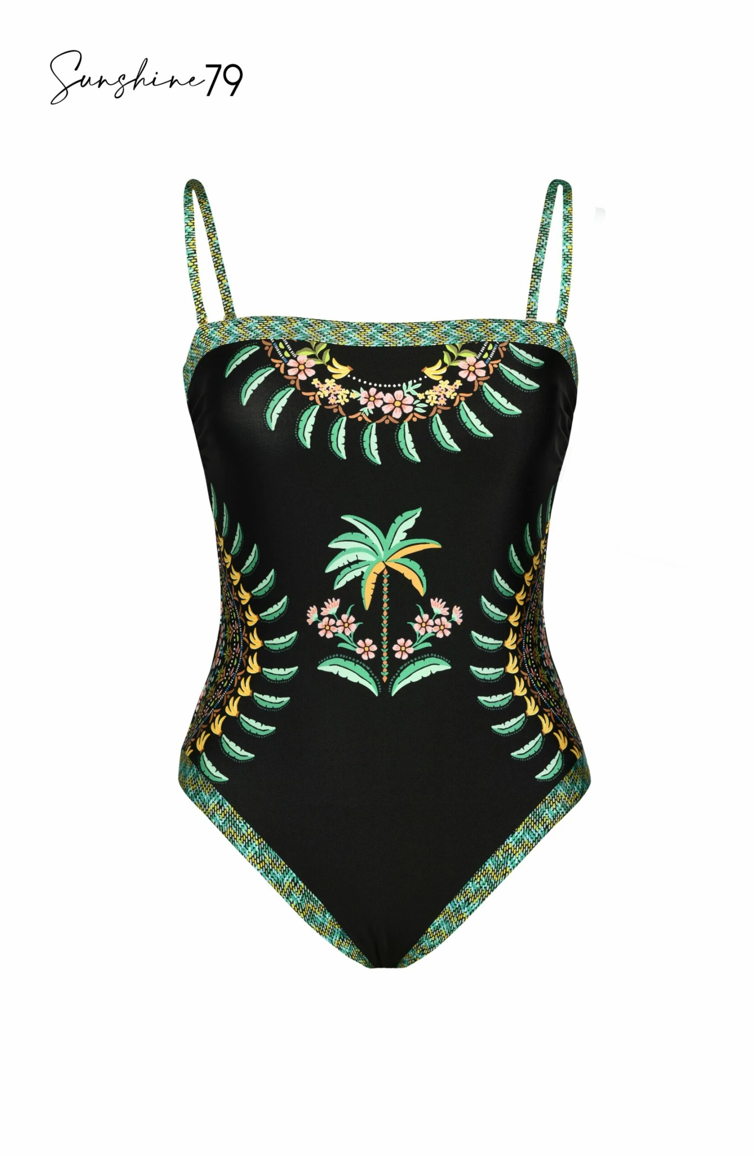 Offering two different looks in one design, this bikini top effortlessly transitions to a strapless bandeau, eliminating tan lines in the process. A subtle sweetheart neckline accentuates the bustline and contrast bands create curves while still offering just-right coverage. Boldly beautiful, this bandeau is printed with bright neon colors of yellow, pink, and aquamarine pop against the black background, creating a bold and striking look that is sure to turn heads.