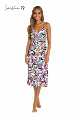 Psychedelic swirls of color in vibrant shades of hot pink, periwinkle blue and citrusy tangerine bring a modish vibe to this midi dress by Sunshine 79. The deep V-neck gathers in the middle with a V-shape gold metal wire and the adjustable straps crisscross and tie in back. Completely versatile, you can throw it over your suit for a classy cover-up or wear solo with a pair of dressy sandals.