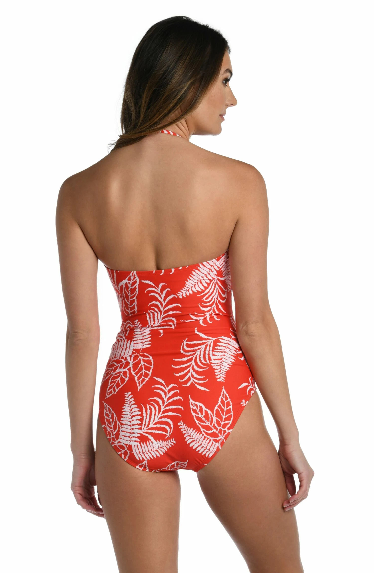 Coming in red hot, this sexy one-piece suit is detailed with a gorgeous tropical-inspired print. A sweetheart neckline with crisscross details at the center accentuates the bust, while a removable strap instantly converts it into a bandeau. Built-in cups keep you feeling lifted no matter how you decide to wear it and a slimming fit shapes and tones so you can feel confident poolside or on the beach.